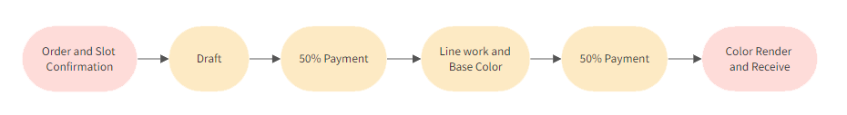 Payment is required 50% upon confirmation of draft, and another 50% upon color render.